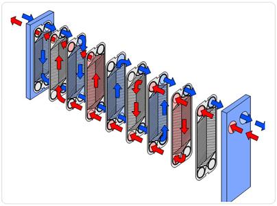 板式換熱器的傳熱原理是根據熱力學定律:“熱量總是從溫度高的物體向溫度低的物體傳遞,當兩種物體間存在溫差就必然有熱量傳遞的過程。”兩種液體在板式換熱器板片兩側對流時,熱量從溫度高的的那側液體傳向溫度低的那側液體(一般情況下,高溫側在一次側,低溫側在二次側)。